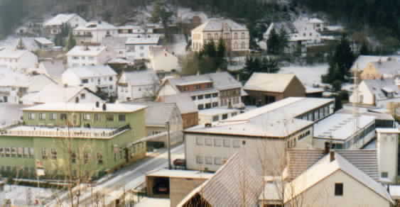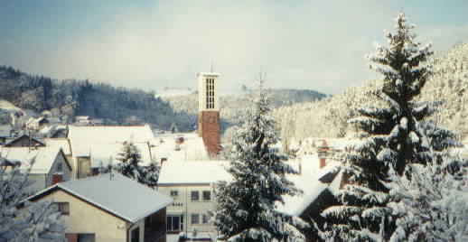 This is a winter picture of our village from another hill. The green building in the foreground is the local bar (notice the fest-stick hanging over the road) and the big building in the upper middle part of the picture is the local school.