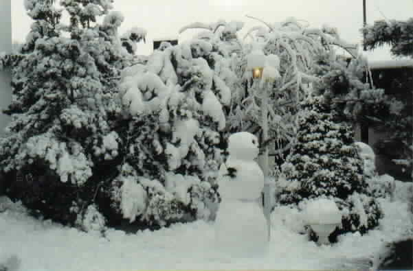 This is a picture in front of our house with a few inches of snow on the ground. Notice the Schneemann by the light!